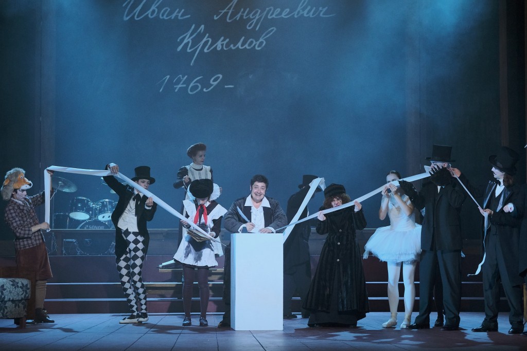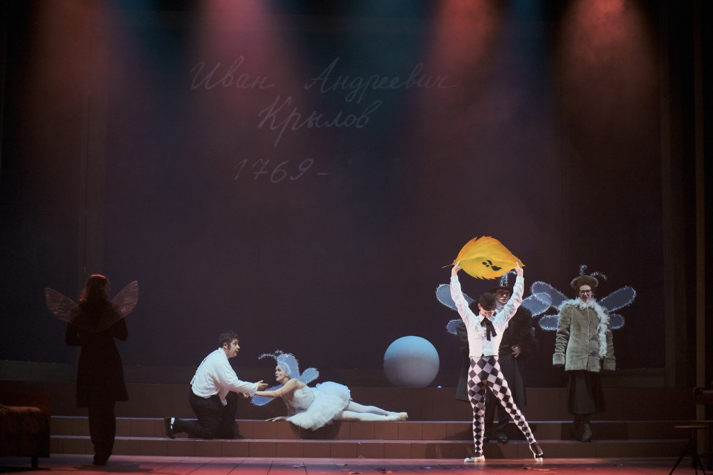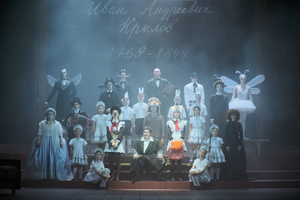 «Крылов жив!» – пишут мелом на школьной доске в финале «Басен Крылова» в Красноярском ТЮЗе. А сам писатель зажигает на сцене, как заправская рок-звезда, не случайно тут вспоминают и поют Цоя. Но в основном все же исполняют басни Крылова, положенные на музыку Дахалэ Жамбаловым, и каждая превращается в эффектный номер или рэп-баттл. Собственно, жанр спектакля обозначен как «Сцены из жизни баснописца в форме концерта».