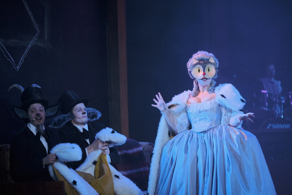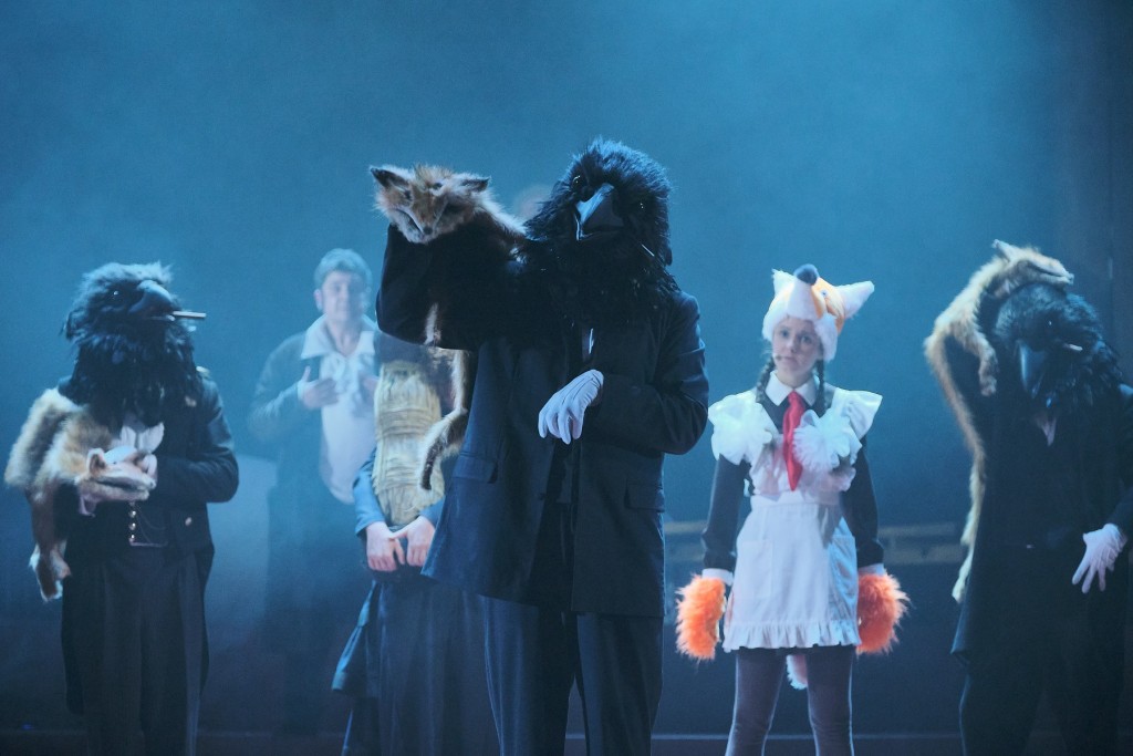 Но есть и третий слой – он служит точкой входа для нас, современных зрителей, которые с Крыловым сталкиваются только в детстве, проходя басни во втором классе, если они, конечно, не поступали на актерские отделения театральных вузов. Спектакль начинается со сцены то ли школьного утренника, то ли театрализованного урока, где учительница (отличная характерная роль Екатерины Кузюковой) уставшим монотонным голосом рассказывает что-то о Крылове, а дети в масках животных вымученно отвечают у доски.