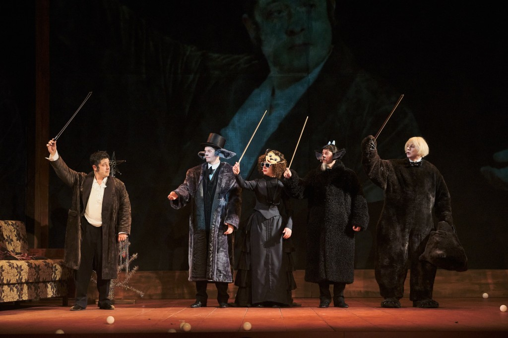 Второй акт начинается с игры в снежки, но веселая забава оказывается метафорой декабрьского восстания на Сенатской площади, где Крылов тоже был, но не примкнул к участникам. И когда на школьной доске рисуют силуэты декабристов и пишут мелом их имена, Иван Андреевич то добавляет, то трусливо стирает свое. Слишком жива в памяти угроза Пугачева «повесить капитанского сына» – до старости является ему в ночных кошмарах. Зима, наш национальный культурный код, тут вообще становится царством смерти: перед болезнью и кончиной Фенечки они наряжают серебристую рождественскую елку, брат Левушка, уходя из жизни, делает «след ангела» в сугробе, а после гибели Пушкина снег засыпает уже всю сцену. Известно, что поэт дружил с Крыловым и заходил к нему за день до дуэли. А в спектакле он появляется в образе стройного, утонченного Комара (Артем Цикало), который жалуется на сквозняк в квартире приятеля, словно заранее чувствует загробный холод.