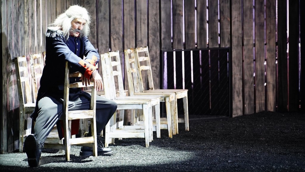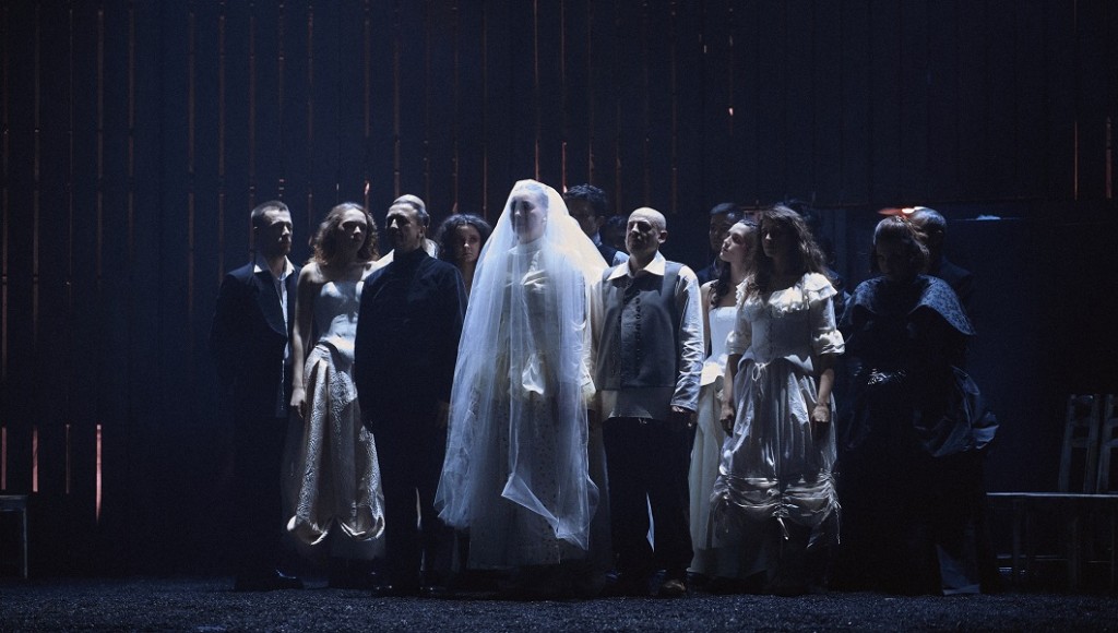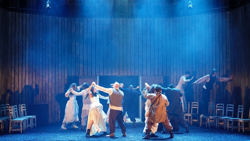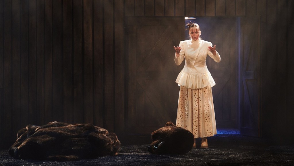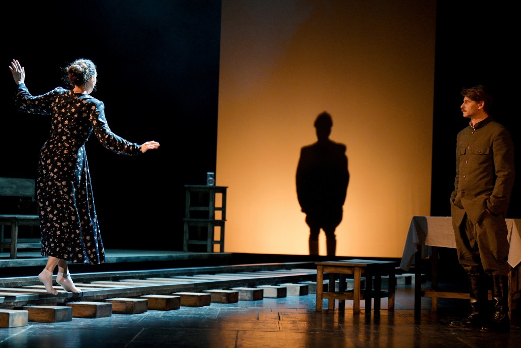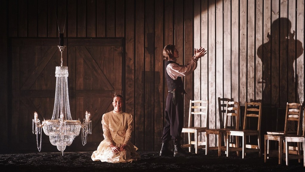 Впрочем, для самого Мурата Абулкатинова это скорее продолжение размышлений, начатых в других постановках. Его режиссерский почерк узнается сразу же — лиричный и меланхоличный. Актеры произносят текст нарочито медленно, словно накапливают энергию, чтобы потом выплеснуть ее в экспрессивном танце. Классический сюжет режиссер не столько осовременивает или интерпретирует, сколько отстраняет, очищает от исторического и бытового контекста. Постоянный соавтор режиссера художник Софья Шнырева выстраивает вневременное условное пространство из грубых досок, меж которых иногда пробивается неземной свет (художник по свету Евгений Ганзбург). Метафизическое пепелище русской жизни с ее вечными заборами и частоколами, где пол засыпан золой от пожара. Для полноты картины перед сценой еще иногда опускается железная решетка — это и клетка с медведем, которого изображают, наваливая на одного из артистов множество шуб, и метафорическая стена, разделяющая влюбленных.
