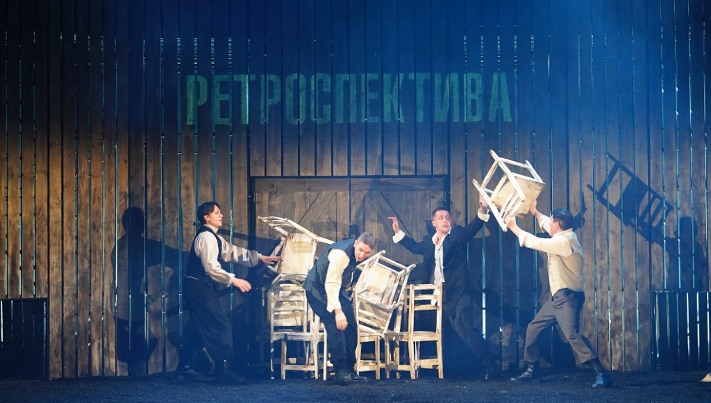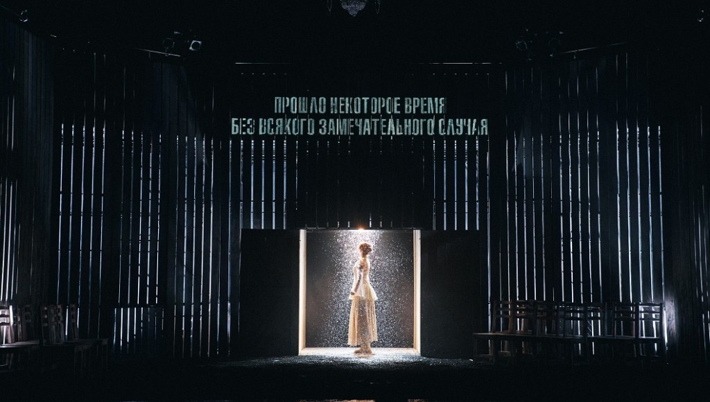 На стене по-киношному высвечиваются титры с названием спектакля.