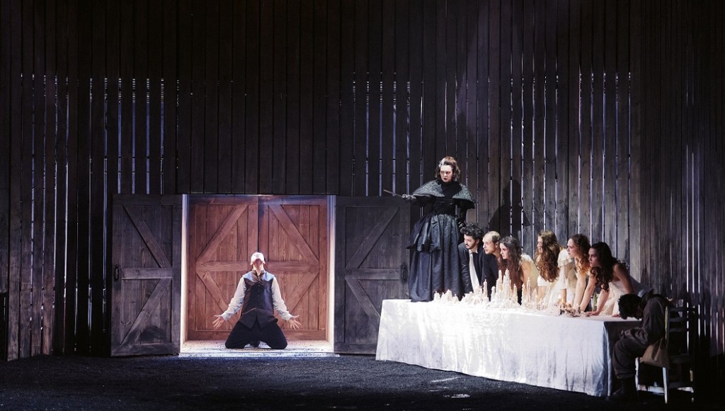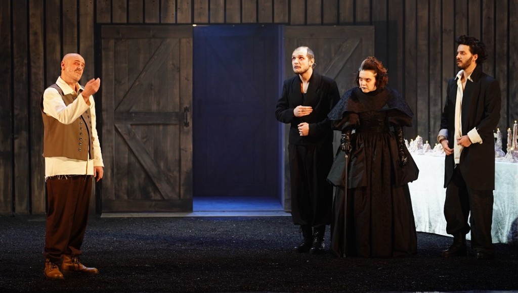 Герой мучительно размышляет: «Как я оказался в этой точке?» Все начиналось с благородных мыслей о мщении за бесчестие и смерть отца, о возмездии, которое должно свершиться на этом свете, а не на небесах. А обернулось «русским бунтом, бессмысленным и беспощадным», как напишет Пушкин уже позже, в «Капитанской дочке». Обернулось поджогом родного дома и страшной смертью в огне пусть не лучших, но все же людей. Эту сцену в спектакле решают условно — артисты обмазывают голые торсы золой, — что не отменяет ужаса происходящего.