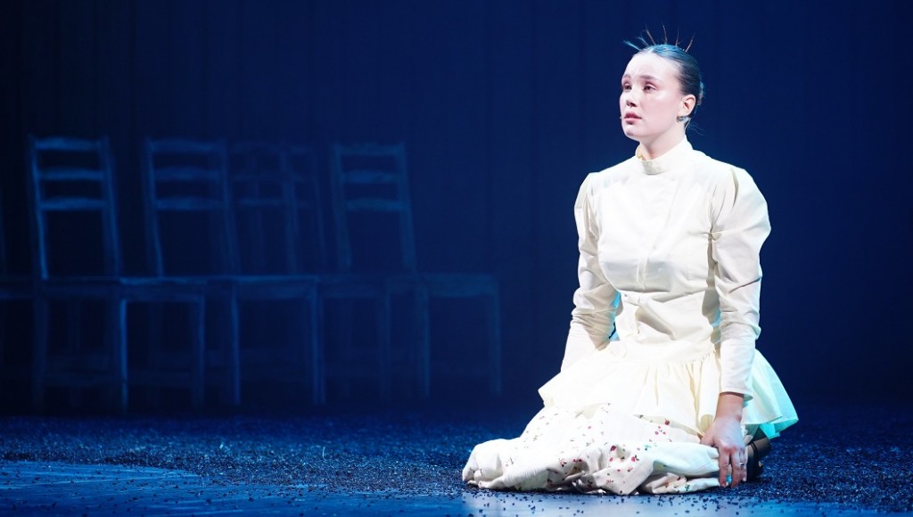 Сцена оформлена аскетично. Кроме фотографий, мы видим только десять стульев и один стол. Алла Васильева мастерски использует этот минимальный набор, чтобы вести зрителей от эпизода к эпизоду.