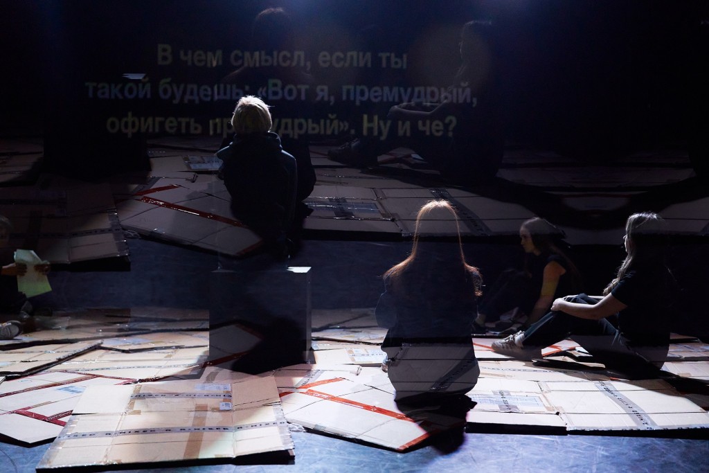 Во время выступлений ребята собирали и складывали картонные коробки одна на другую и записывая на них маркерами ключевые слова из историй (что суетой и шуршанием несколько отвлекало от высказываний). Но в конце блока про мечты участники показа стали крушить картонное сооружение под песню с эмоциональным надрывом, в которой неоднократно повторялись слова «их не слышат» и «не стесняйся своих чувств». После они принялись собирать коробки вновь. Коробки могут восприниматься и как рухнувшие детские мечты, и как кирпичики стены, которой ребята пытались защититься от мира. Это разрушение – способ высвободить накопившуюся негативную энергию, заявить миру о боли внутри. А, возможно, кто-то хотел спрятаться в коробку от этого мира.
