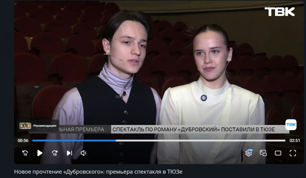 Новое прочтение «Дубровского»: премьера спектакля в ТЮЗе https://ktyz.ru/press/novoye-prochteniye-dubrovskogo-premyera-spektaklya-v-tyuze.htm https://ktyz.ru/press/novoye-prochteniye-dubrovskogo-premyera-spektaklya-v-tyuze.htm О премьере спектакля «Дубровский» на сцене Красноярского ТЮЗа рассказывает Софья Осипович в телевизионном сюжете «Новостей ТВК».