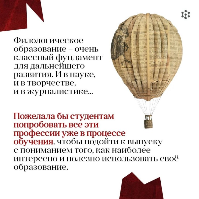 • Чего я желаю студентам ИФиЯК СФУ? Внимательнее отнестись к тому, что с ними происходит сейчас. Я постоянно вспоминаю наших потрясающих педагогов, но, наверное, во время учёбы я их недостаточно ценила. Думаю, сейчас слушала бы их с гора-а-аздо большим интересом. Образование филолога, литературоведа – это классный фундамент. Но пробовать себя в профессии надо не после, а во время учёбы. Понимать, кто ты – журналист, преподаватель, учёный-лингвист лучше в студенчестве, пробуя различные варианты.